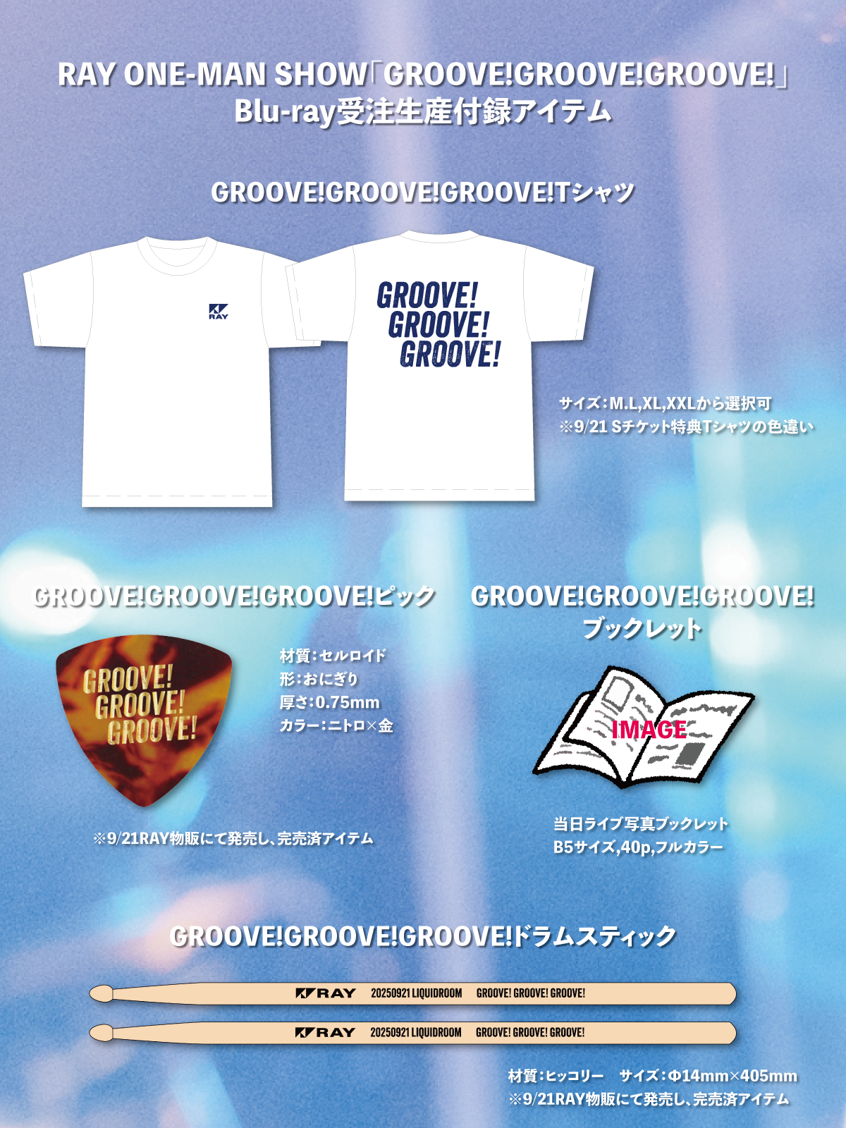 3DRUMSワンマンライブBlu-ray受注開始 NEWS 2025.12.29 3DRUMSワンマンライブBlu-ray受注開始 9/21恵比寿リキッドルームにて開催された3DRUMS編成ワンマンライブ「GROOVE!GROOVE!GROOVE!」のBlu-rayの発売が決定!✅受注生産にて様々な付録アイテム付きバージョン※付録アイテム付きは受注生産のみ※受注生産後の一般販売はごく少数のみを予定✅受注期間:〜2026/1/3 23:59■商品展開⚠️各展開で商品ページが異なるのでご注意ください①Blu-ray+ピックhttps://rayworld.official.ec/items/127086803②Blu-ray+ピック+Tシャツhttps://rayworld.official.ec/items/127087043③Blu-ray+ピック+ドラムスティックhttps://rayworld.official.ec/items/127087244④Blu-ray+ピックTシャツ+ドラムスティック+ブックレットhttps://rayworld.official.ec/items/127087416